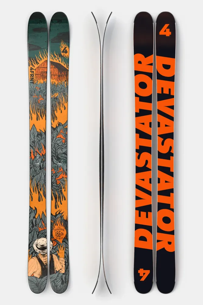 The name says it all. The Devastator has earned its place as a 4FRNT icon for its ability to destroy any terrain in sight. Its signature multi-radius rocker profile lets you surf powder with ease, pivot through tight terrain, and slash with precision. This modern freeride design enables the sidecut geometry to work in unison with the pre-bent rocker shape, giving you feeling of camber in firmer conditions. With explosive pop, a light swing weight, and unwavering stability, the Devastator is a true freeride weapon—built to dominate in every condition, on every run.